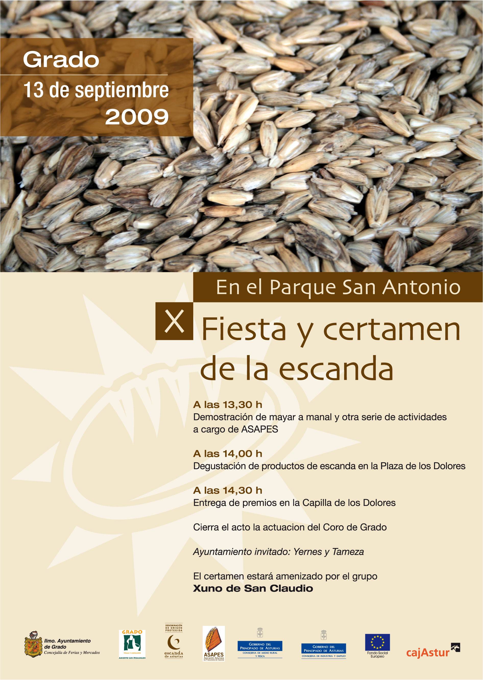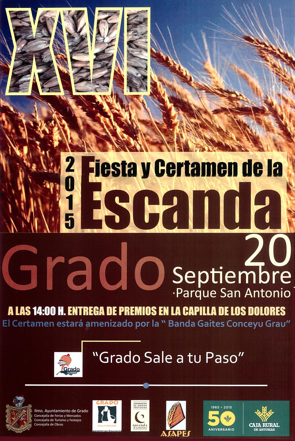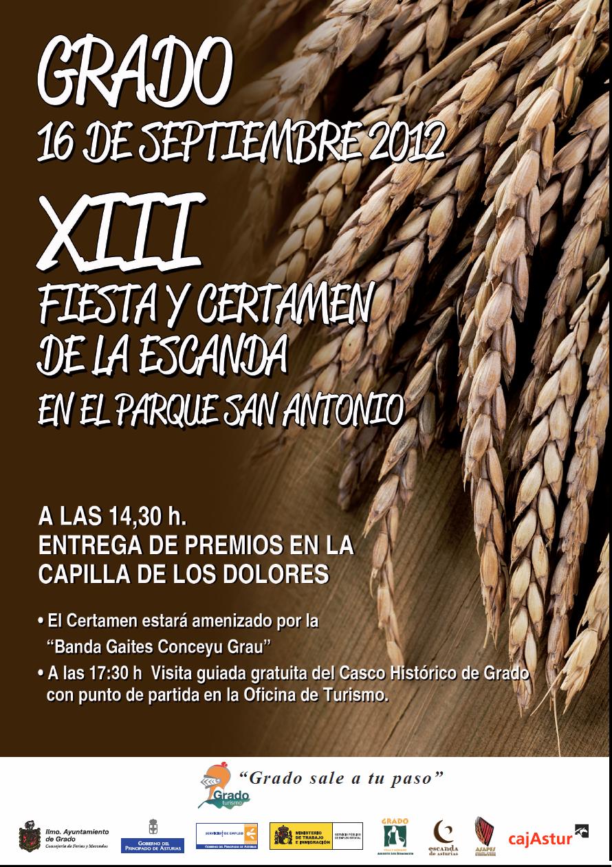 XXIV CERTAMEN DE LA ESCANDA se celebrará en la villa de Grado el 14 de septiembre de 2025, en la Plaza del Ayuntamiento. Organizado por el Ayuntamiento de Grau/Grado y con la colaboración de la Asociación Asturiana de Productores de Escanda.