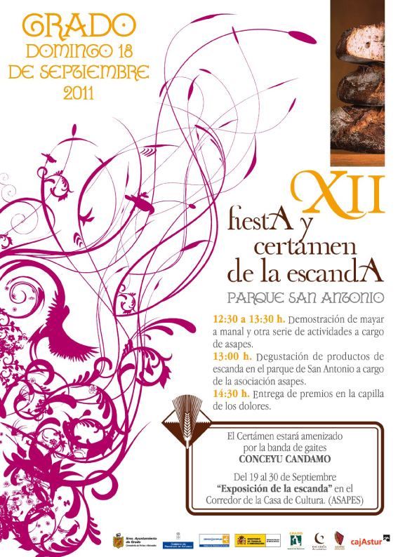 Hace años que el Ayuntamiento de Grado ha lanzado la iniciativa de organizar un mercado temático para potenciar el cultivo y la utilización de escanda en nuestra gastronomía, por un lado con la utilización del pan hecho con dicho cereal y por otro con la investigación de nuevas recetas basadas en la escanda, que aporten sabores innovadores dentro de las mesas asturianas. Ese mercado temático que nació y mantiene la denominación de Certamen de la Escanda consta de dos partes.