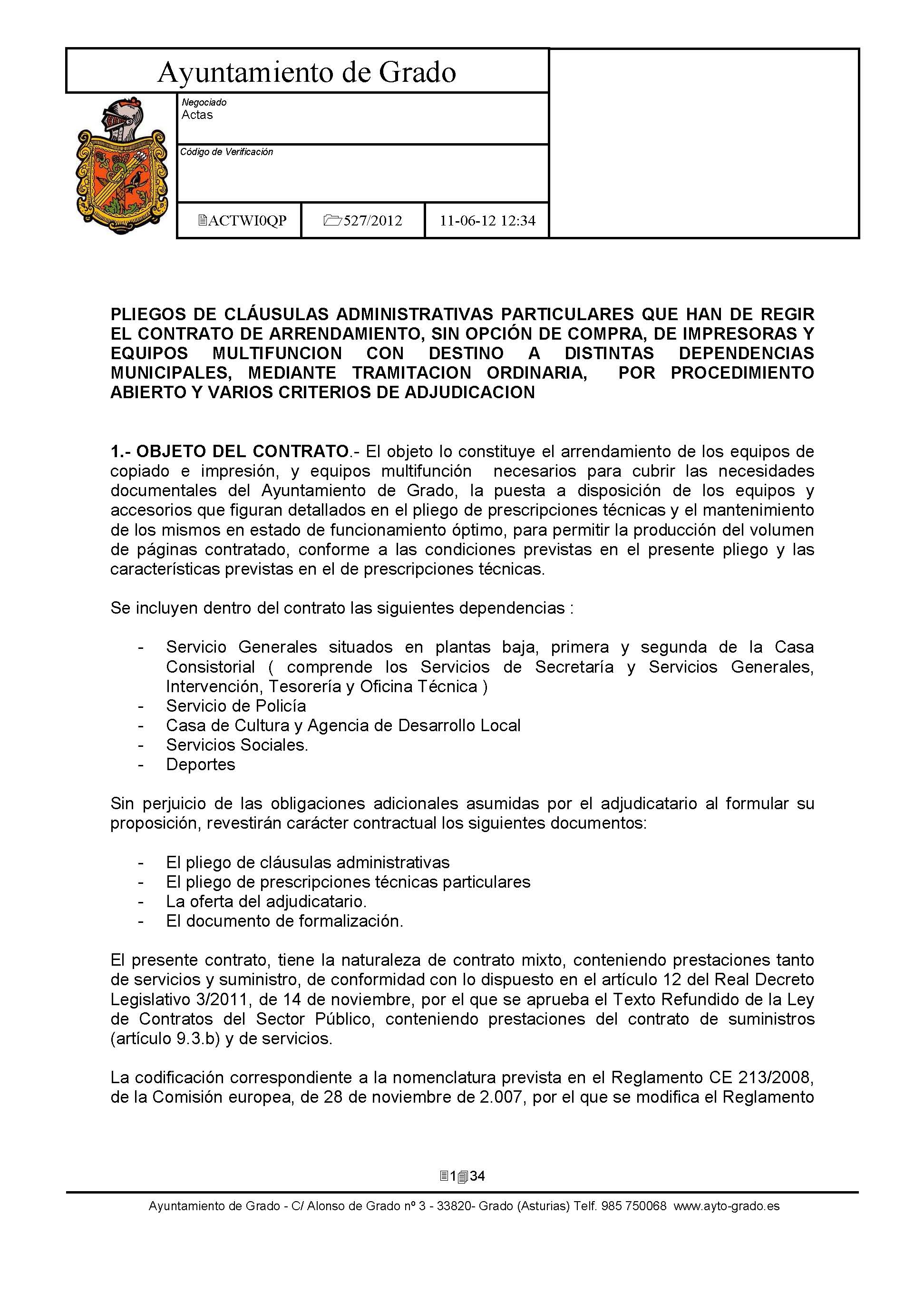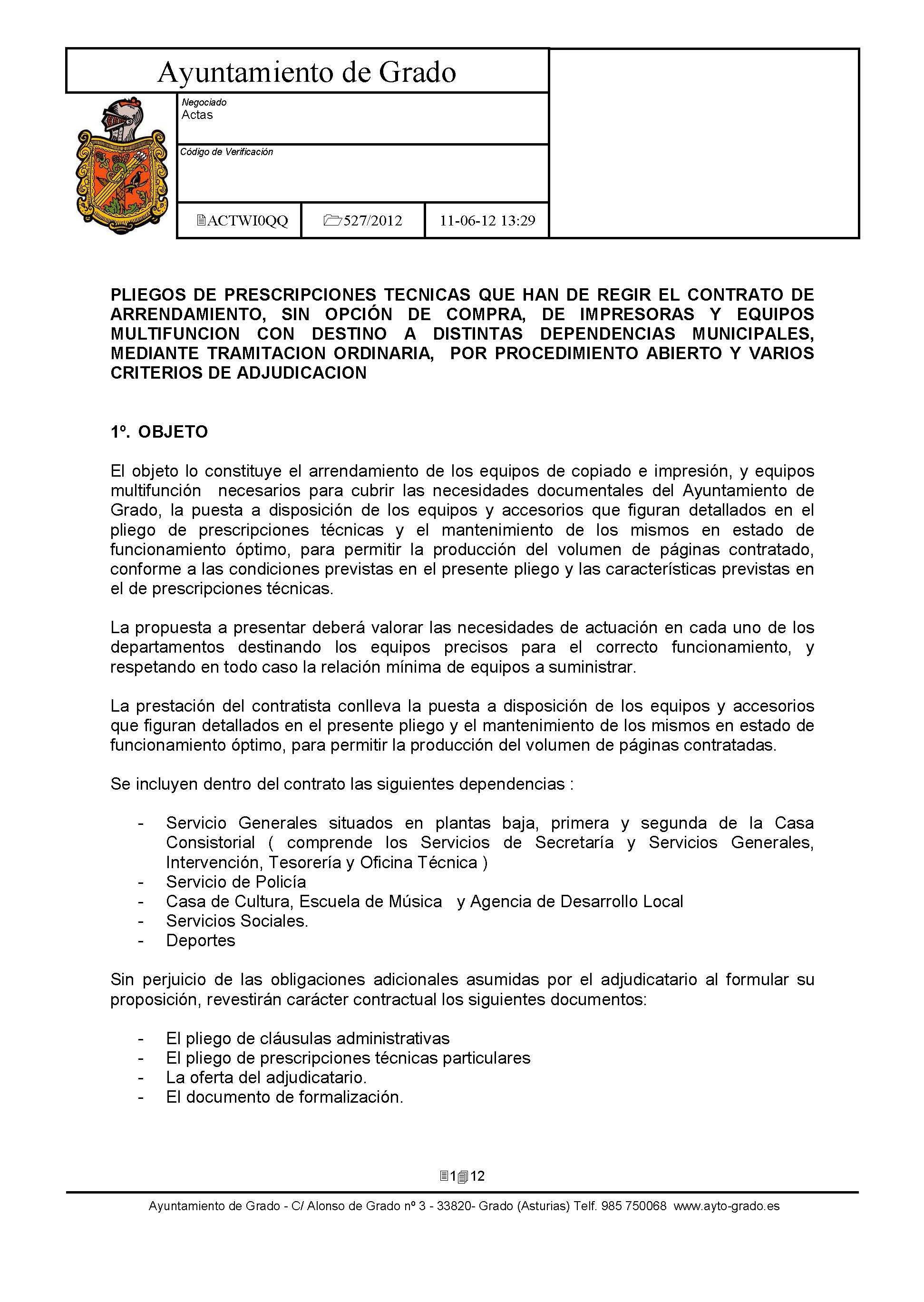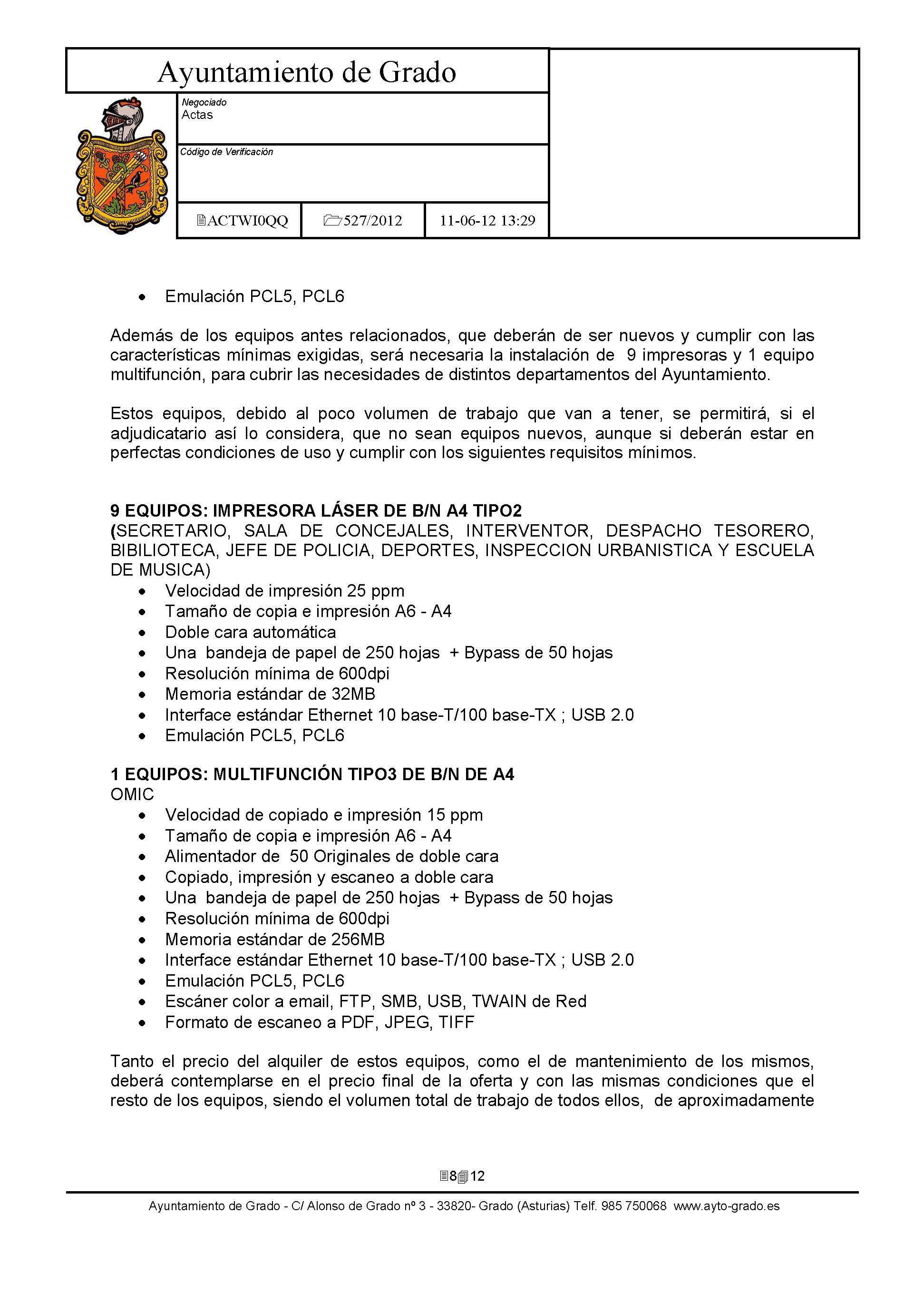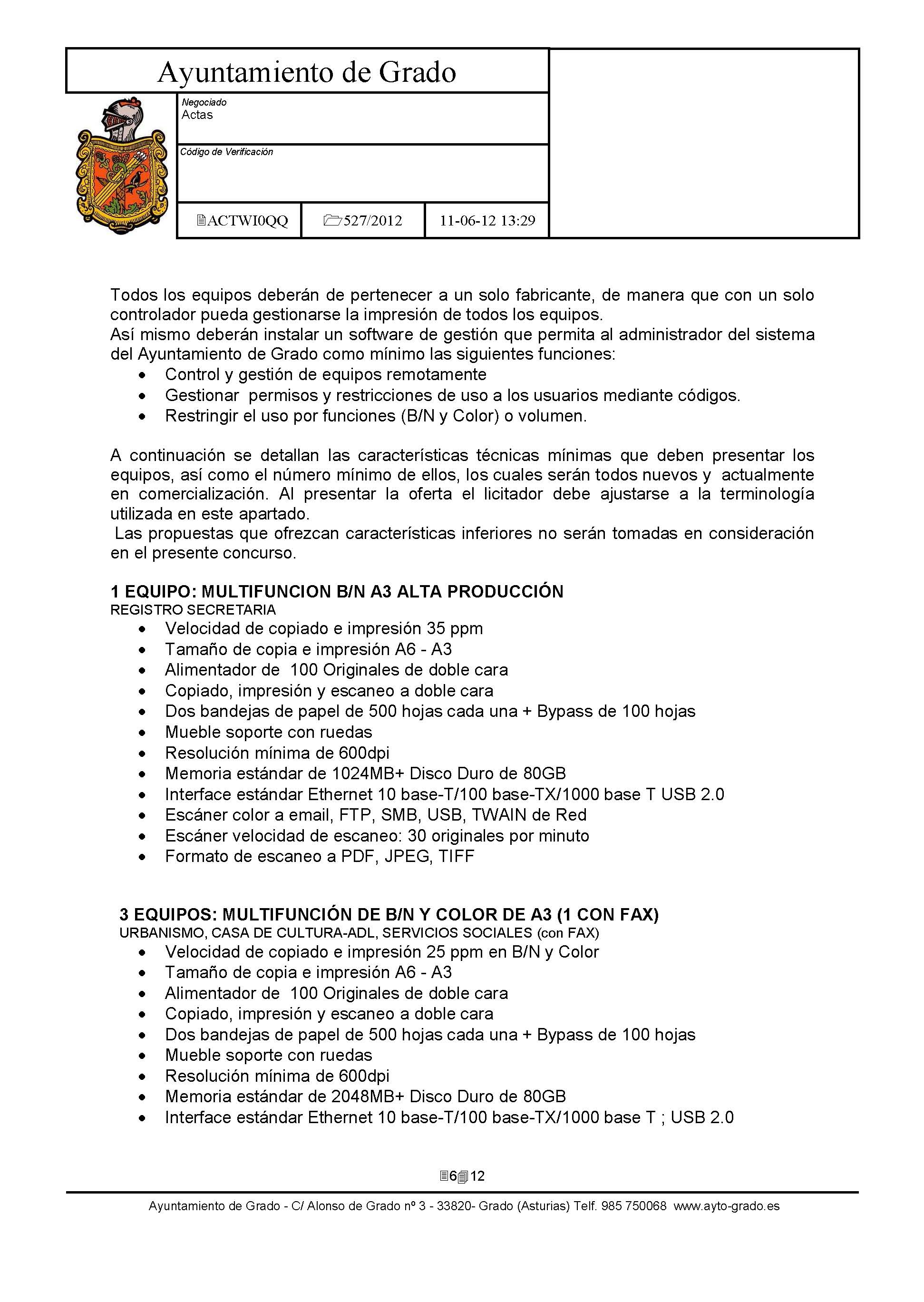 Arrendamiento sin opción de compra de Impresoras y Equipos Multifunción con destino a dependencias municipales. [Exp: 527/2012]